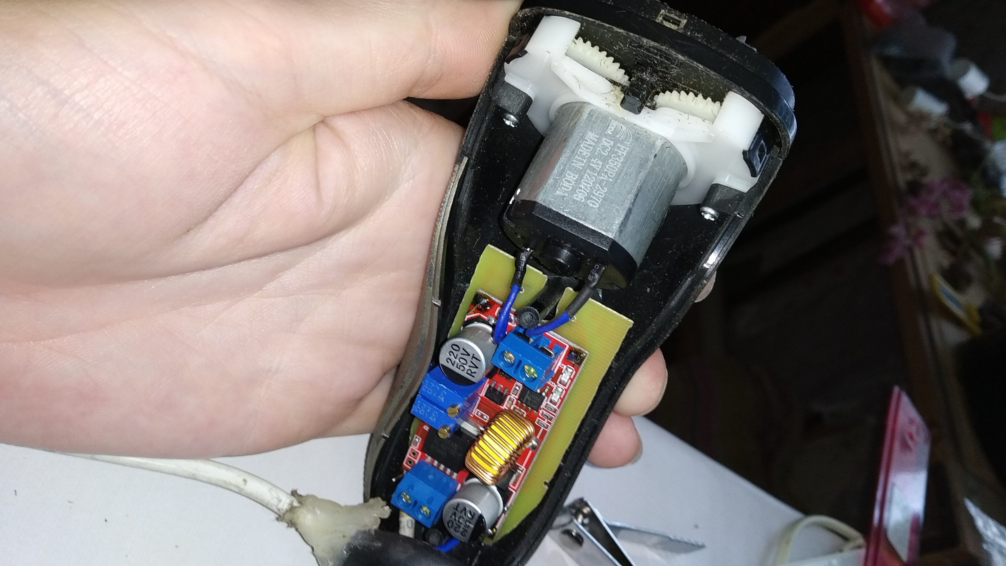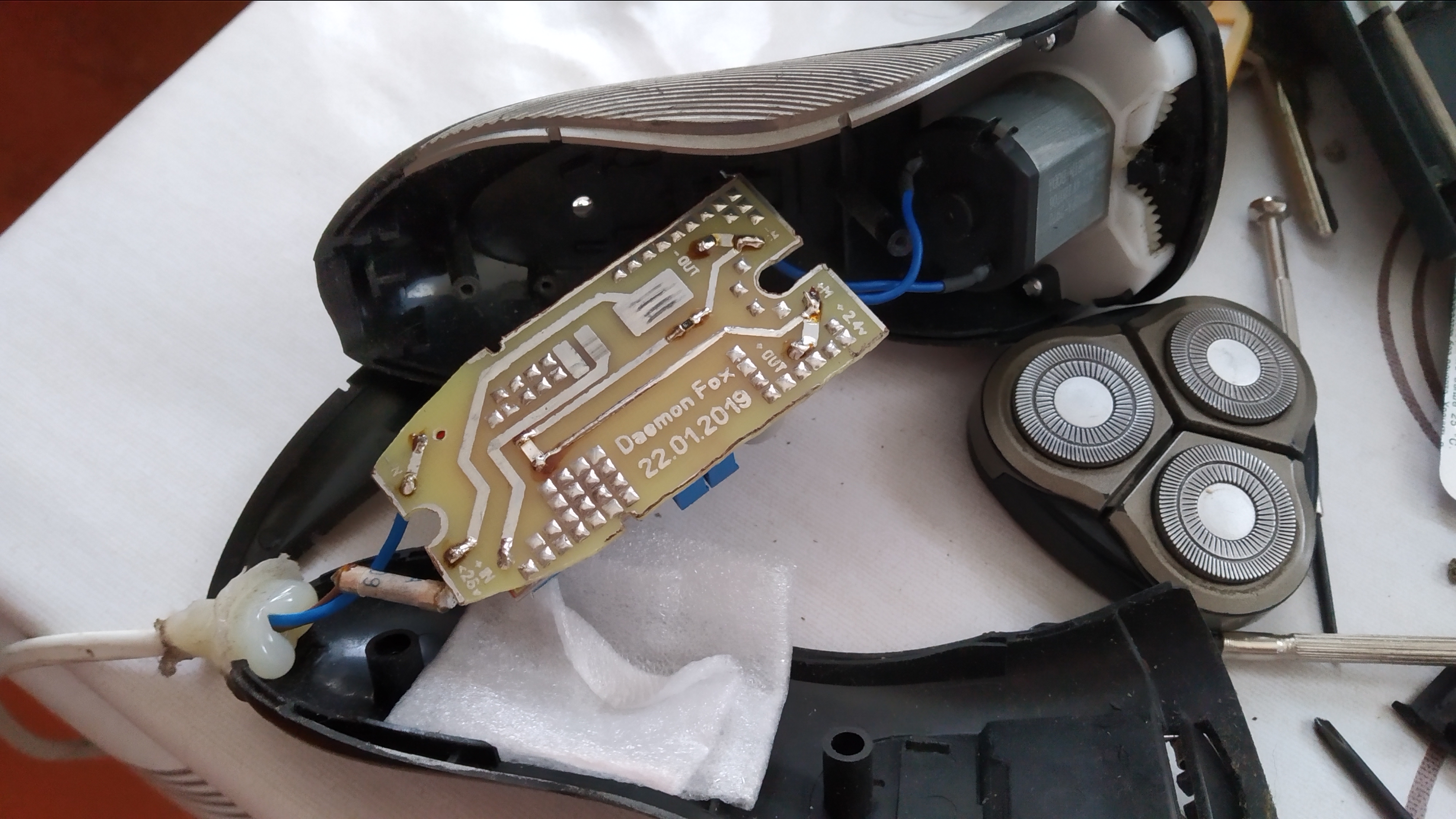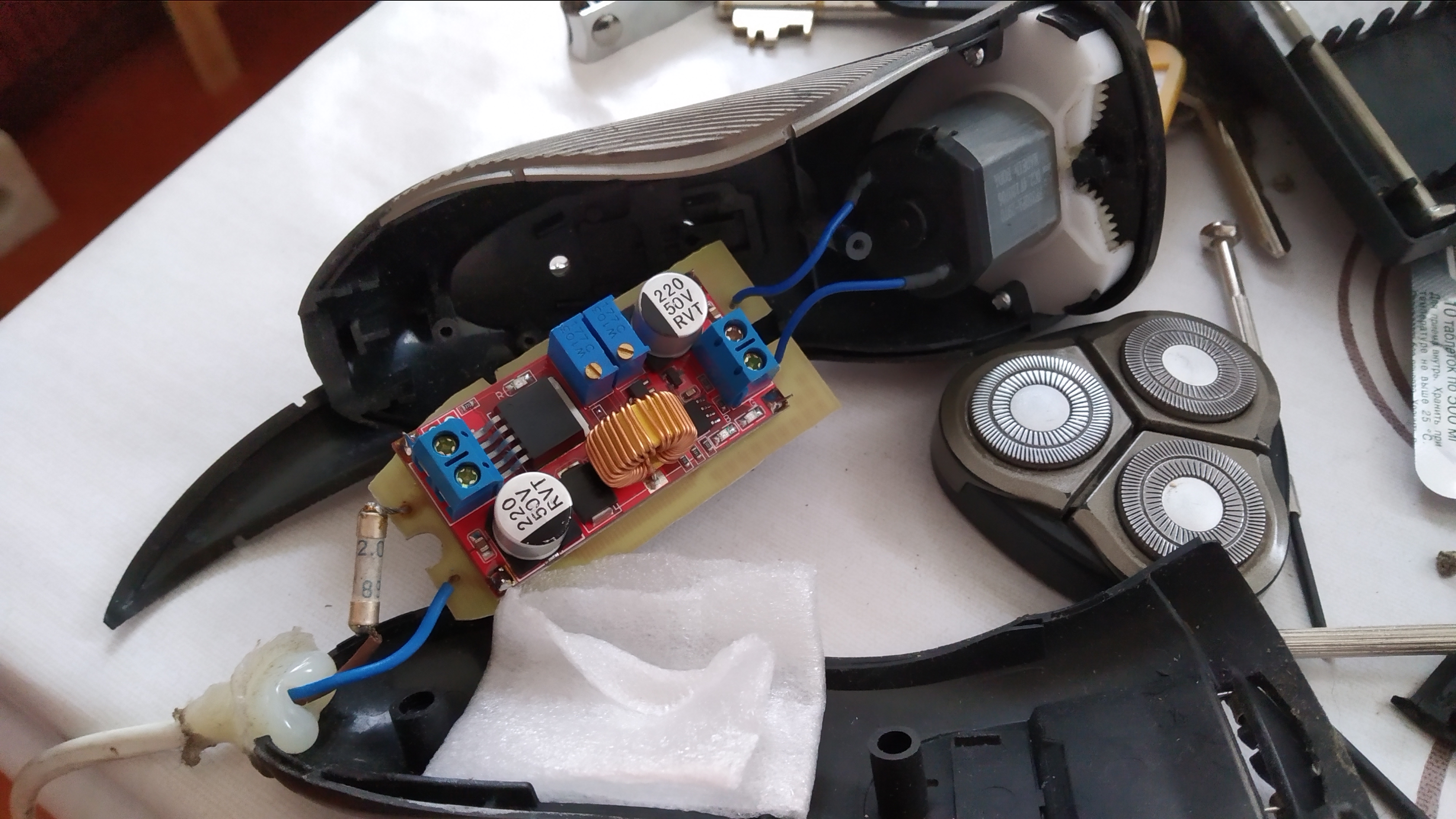 Модификация электрической бритвы. Замена внутреннего источника питания (аккумулятор формата АА) на внешний источник питания (блок питания 12в или любой внешний аккумулятор). Входное напряжение до 30вольт.